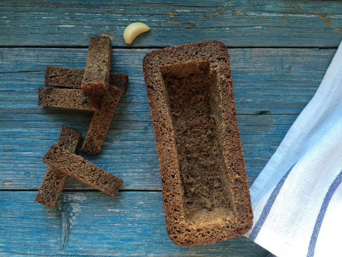 Срежьте у буханок хлеба верхушки и аккуратно удалите мякиш, стараясь не повредить дно и стенки. Смажьте буханки изнутри чесноком и сливочным маслом и уберите в духовку на 15 минут.