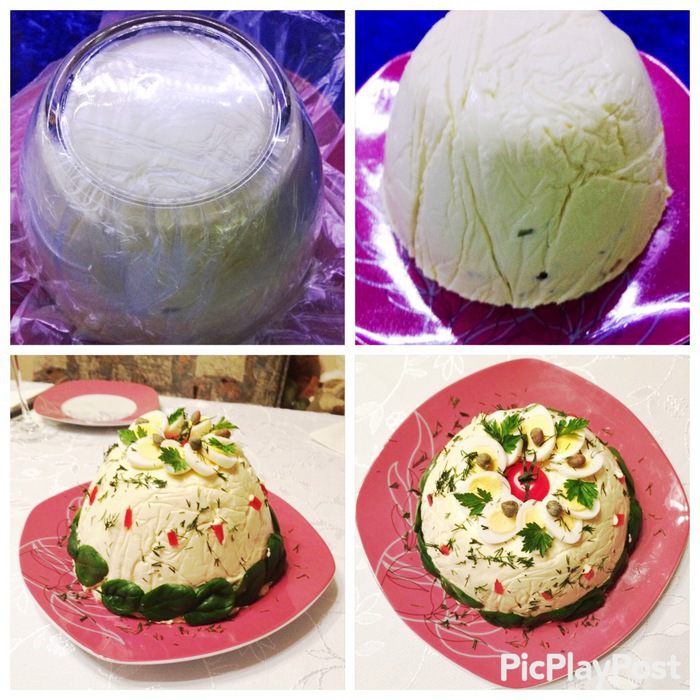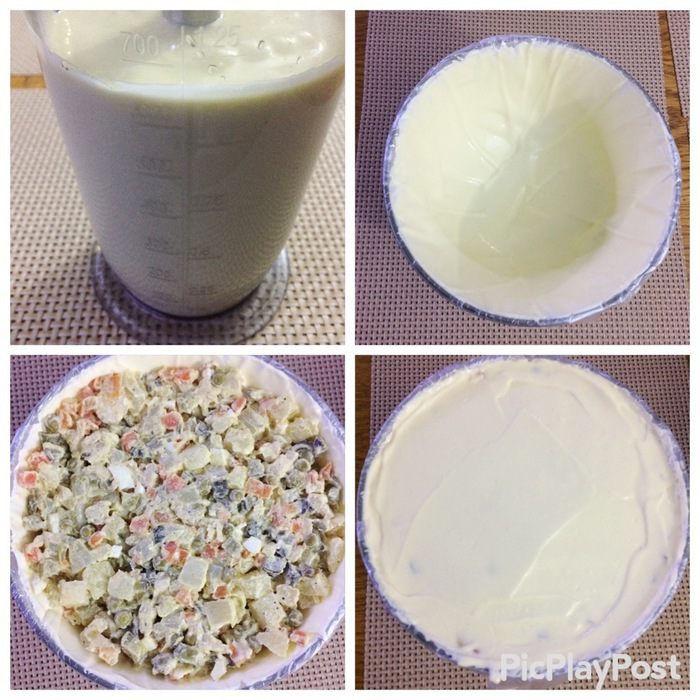 Смешиваем майонез с остывшим желатином. Вынимаем форму из морозилки. Наливаем майонезное желе в форму и аккуратно тонким слоем распределяем по всей форме. Т.к. форма холодная, то майонез достаточно быстро начнет схватываться. Укладываем салат в форму, сверху распределяем тонким слоем майонез. оборачиваем пленкой и отправляем в холодильник на несколько часов, до полного застывания).