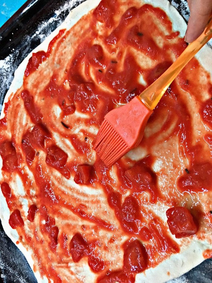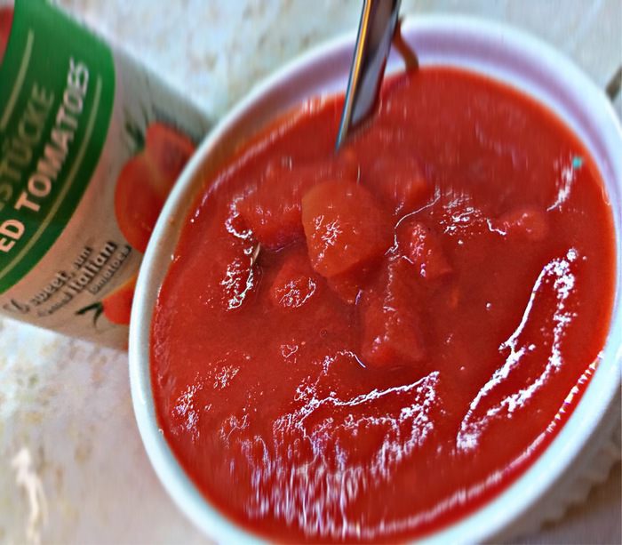 Готовим соус. Я люблю делать из свежих томатов, но под рукой оказалась только баночка с томатами в собственном соку (просто резанные помидоры, без добавления чего бы то ни было еще, даже соли), такие томаты и сами итальянцы прекрасно используют даже больше, чем свежие. Так вот, в готовые резанные помидоры добавляем соль, перец, сушеный чеснок из мельнички, базилик, розмарин и чили.
