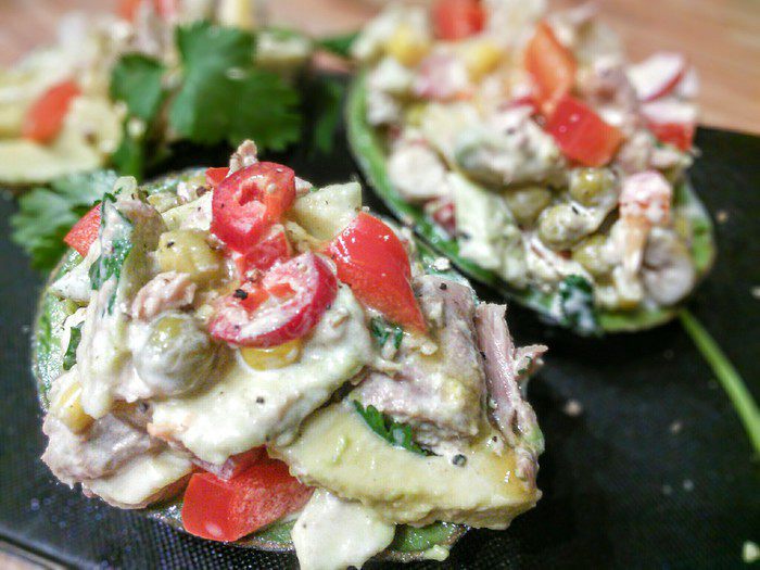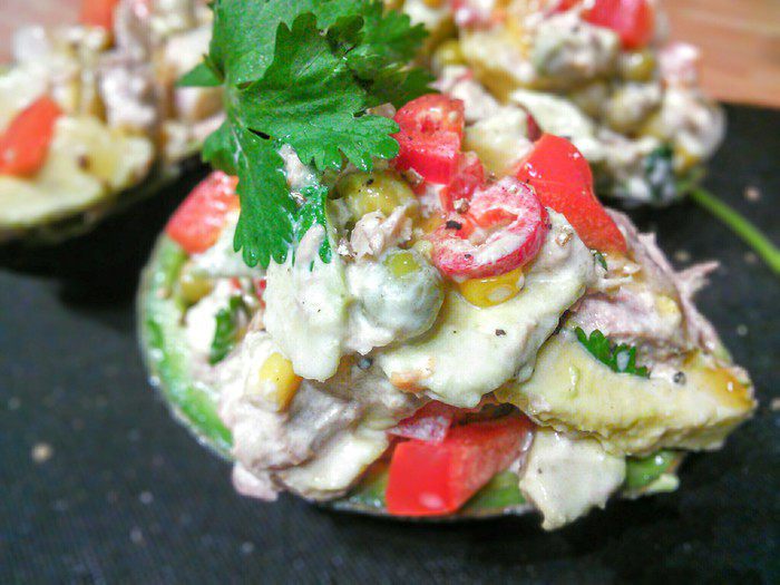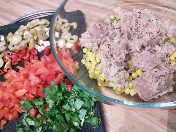 В миске смешать горошек, кукурузу, тунец. Добавить нарезанный кубиком перец болгарский, чили, оливки и кинзу. Посолить и поперчить по вкусу. Смешать с майонезом и лимонным соком.