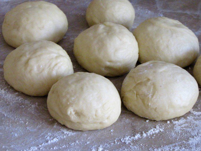 Разделать тесто на две равные части. Одну часть положить обратно в миску и накрыть. Другую разделать на 8 одинаковых кусочков и скатать их в шарики. Накрыть полотенцем и оставить на 10 минут.