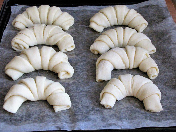 Сформировать рогалики и выложить на противень, застеленный пекарской бумагой. Бумагу я смазала маслом, на всякий случай. Дать рогаликам подойти.