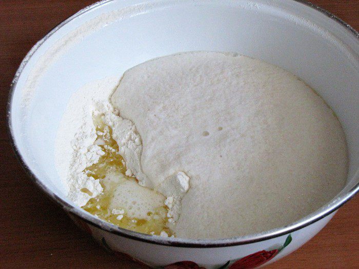Затем взбить яйцо с солью и оставшимся сахаром. Соединить с просеянной мукой, опарой и растопленным сливочным маслом.