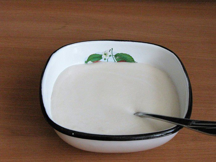 В теплом молоке растворить дрожжи. Добавить 1 ст. л. сахара и 2 ст. л. муки (из общего количества), перемешать. Дать подойти до «шапочки» 10 — 15 минут.