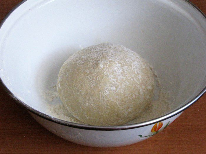 Замесить мягкое тесто. Собрать тесто в шар и положить в миску присыпанную мукой. Накрыть полотенцем и поставить в теплое место. Я ставлю в слегка прогретую духовку.