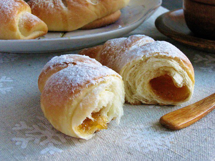 Нежные, мягкие, воздушные молочные рогалики с вашей любимой начинкой. Сегодня я испекла рогалики с абрикосовым конфитюром. Можно испечь с любым густым вареньем, джемом, маком и т. д. К вечернему или утреннему чаепитию очень замечательно! Особенно хороши рогалики с молоком.