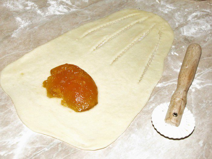 Затем раскатать каждый шарик в овал, одну половину овала сделать шире. Смотрите, как на фото. С узкого края сделать четыре прорези с помощью кулинарного колесика или ножа. Выложить начинку на широкий край.