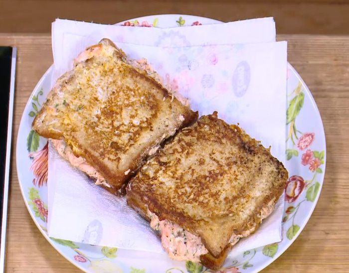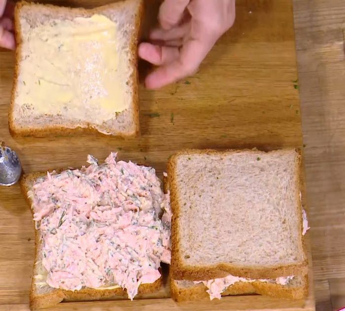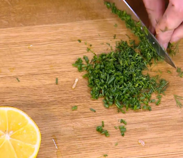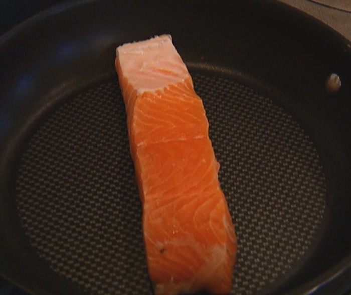 Семгу сбрызнуть лимонным соком и 1–2 ст. ложками оливкового масла, немного посолить, поперчить и дать слегка замариноваться, затем выложить на разогретую сковороду кожей вниз и, не переворачивая, пожарить. За 2–3 минуты до готовности накрыть сковороду крышкой.