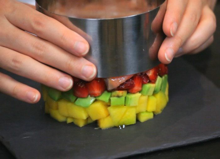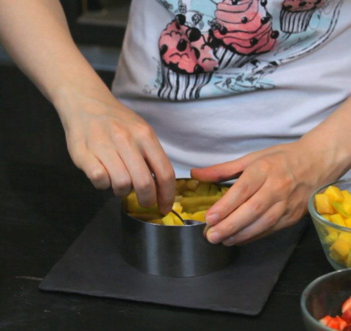 Нарезать все ингредиенты кроме лимона кубиком. Выложить сперва слой манго.