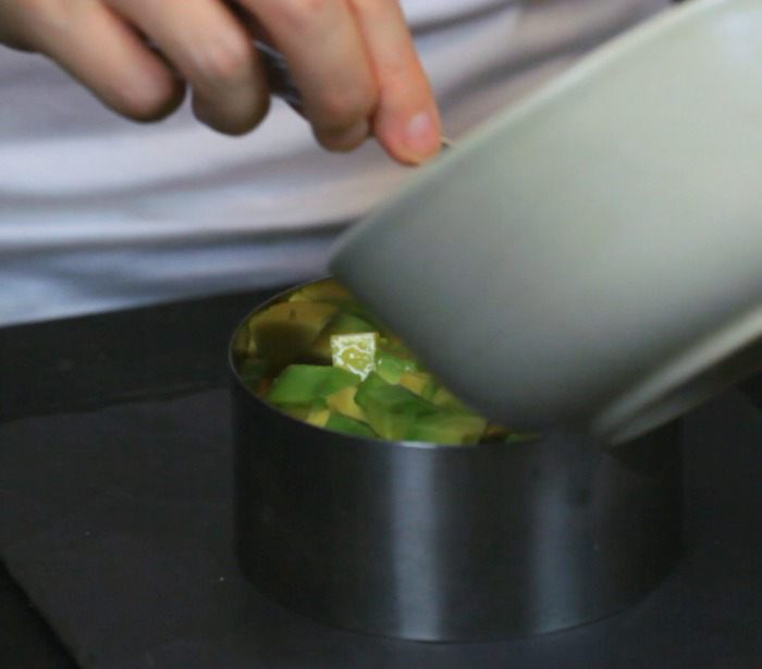 Затем слой авокадо. Авокадо перед сборкой лучше взбрызнуть лимонным соком, чтобы не изменился цвет.