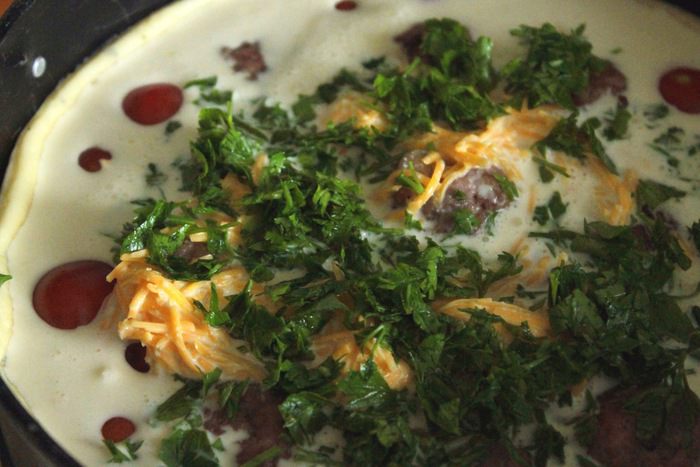 Для заливки венчиком слегка взбить яйца и сливки, добавить тертый сыр, соль, зелень.