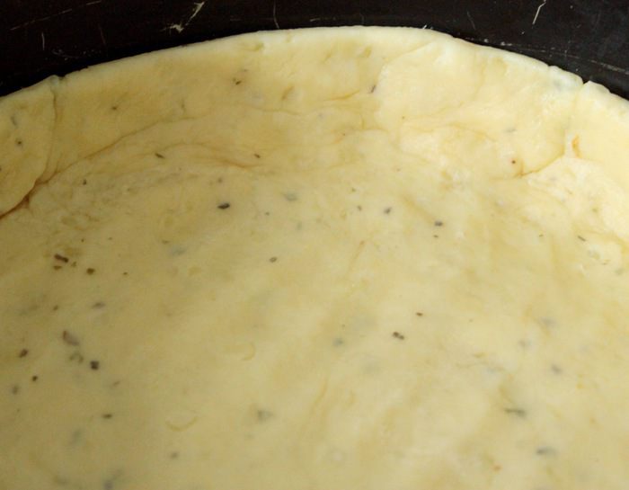 Раскатать тесто и выложить в форму диаметром 21 — 22 см. Сформировать бортики.