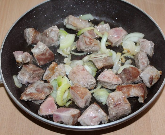 Свинину нарезать небольшими кусочками, обжарить 4 — 5 минуты до золотистой корочки. Добавить нарезанный полукольцами лук и измельченный чеснок, обжариваем.