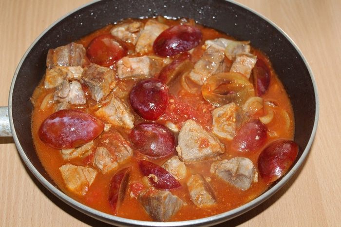 Сливы лучше взять крепкие, разрезать пополам, вынуть косточки, добавить к мясу, влить немного воды 100 — 150 мл, добавить мускатный орех. Все потомить под крышкой до готовности мяса 25 — 30 минут.