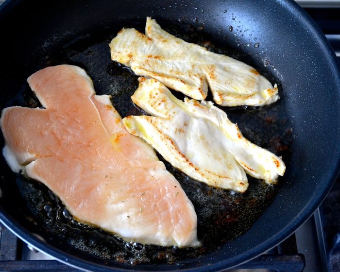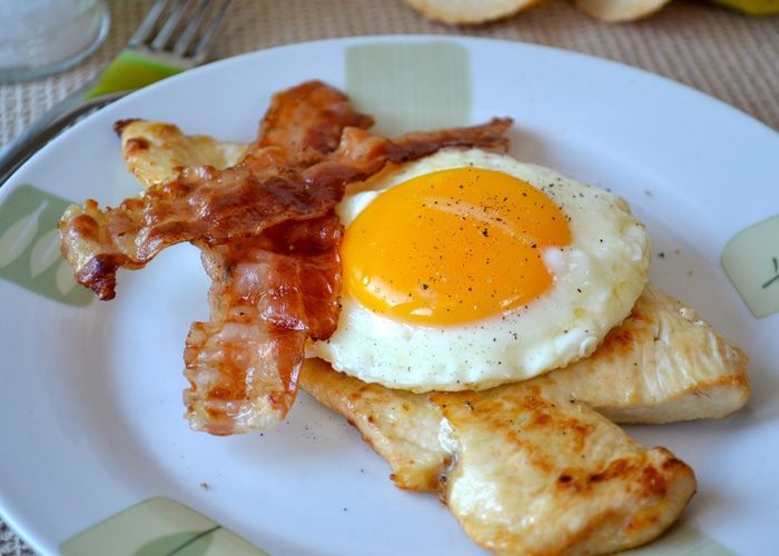В разогретую сковороду, где обжаривались отбивные выложить белки. Дать им обжариться примерно минуту, и как только вы увидите, что белок "схватился", сделать тыльной стороной ложки небольшие 4 углубления и выложить в каждое из них по желтку. Слегка посолить и поперчить (по желанию), накрыть крышкой и дать обжариться буквально 1,5-2 минуты.