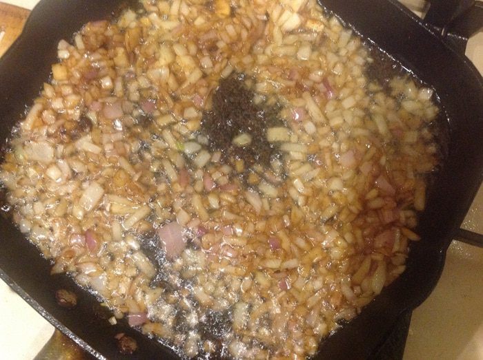 В сковороду, где жарилось мясо, налить масло и обжарить лук, соскребая мясные приварки, 3 мин.