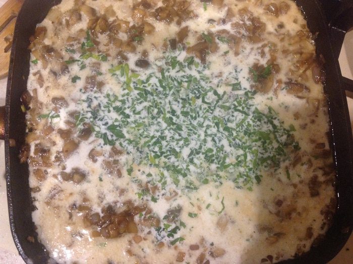 Влить бульон, сливки, добавить петрушку. Перемешать, довести до кипения. При подаче мясо полить соусом.