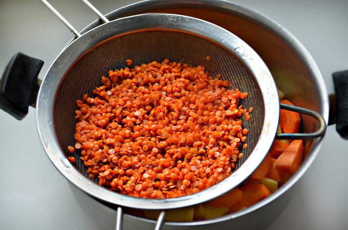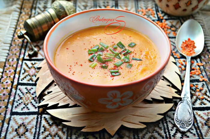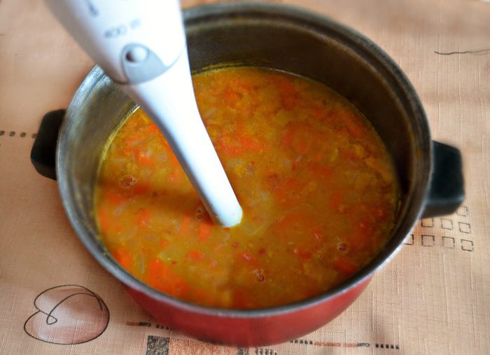 Промойте чечевицу и добавьте в кастрюлю. Залейте водой (примерно 1,5 л), добавьте томатную пасту и варите с закрытой крышкой 1-1,15 ч. Во время варки периодически помешивайте суп и при необходимости добавьте воды. К концу варки посолите по вкусу, добавьте сладкий красный перец и куркуму.