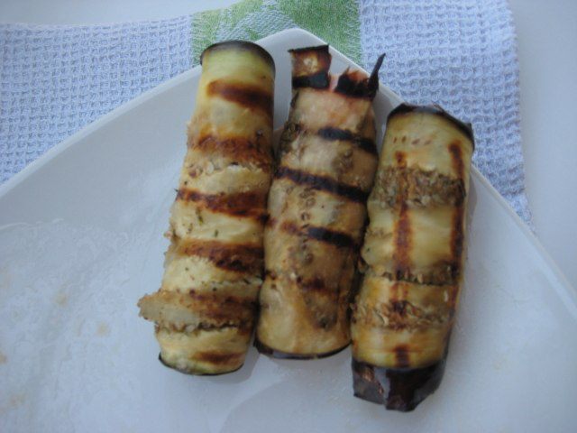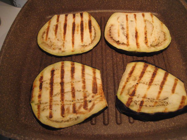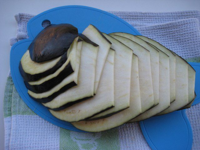 Крупный баклажан нарезать тонкими пластинками.