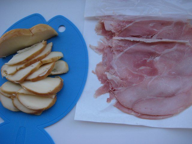 Ветчина (прошутто) нужна тонкой нарезкой, сыр нарезать небольшими кусочками.