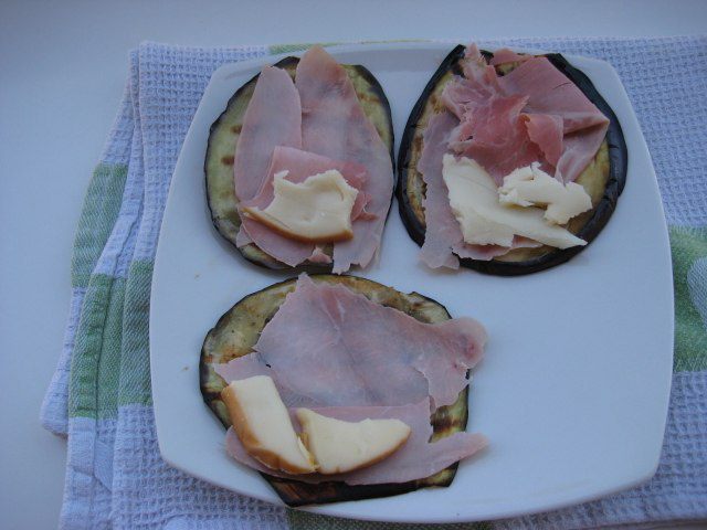 На пластинку баклажана положить ветчину и кусочек сыра.