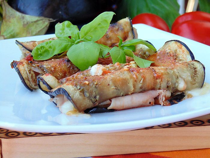 Замечательная горячая закуска из баклажанов, прошутто, сыра в томатном соусе. Рекомендую!