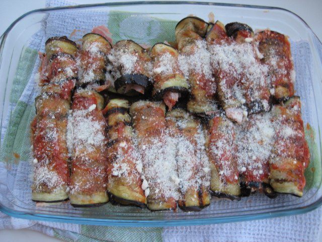 Форму для запекания смазать половиной соуса. Выложить рулетики, смазать оставшимся томатным соусом. Посыпать тертым пармезаном.