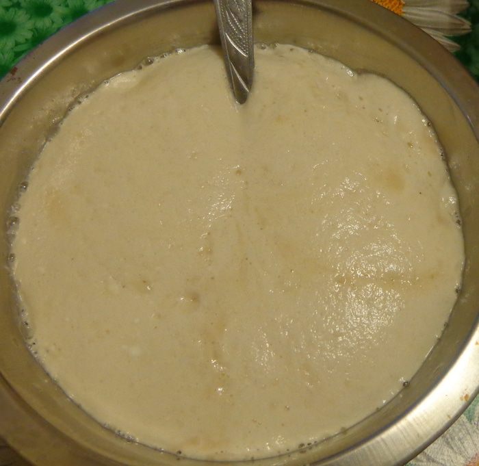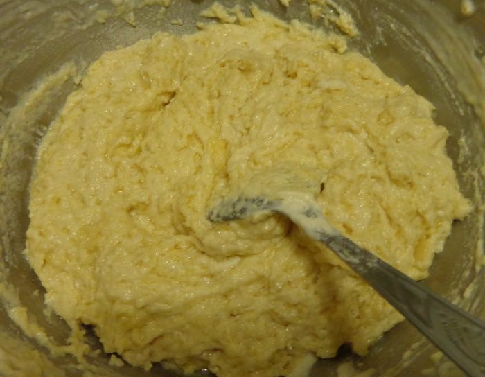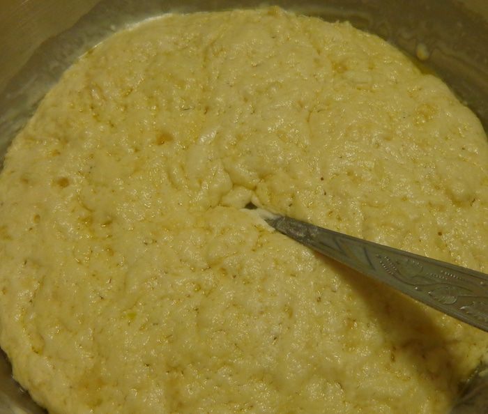 Смешать масло, чесночную смесь и муку. Получится довольно жидкое тесто. Муку не добавлять!