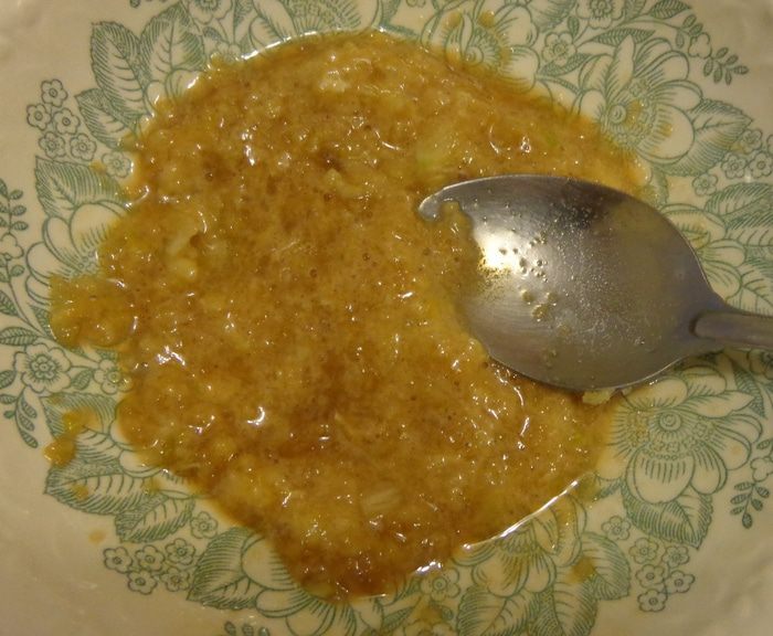 Почистить и раздавить чеснок, добавить соевый соус и соль. Погасить соду уксусом и добавить в смесь.