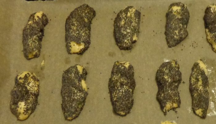 От готового теста отрывать кусочки величиной с грецкий орех, придавая им продолговатую форму . Каждый кусочек обвалять в маке...
