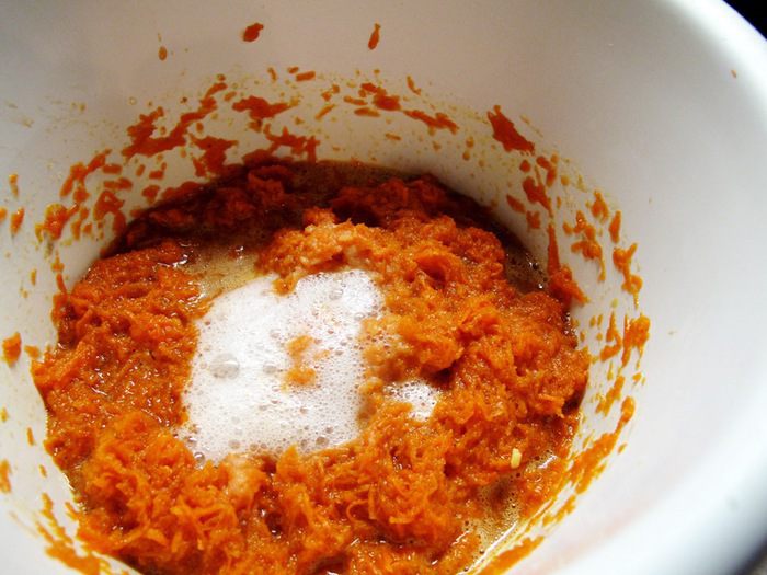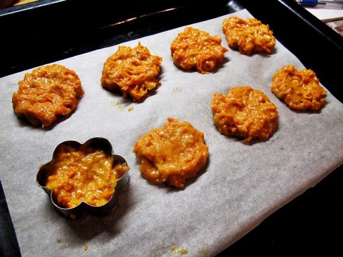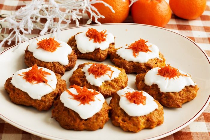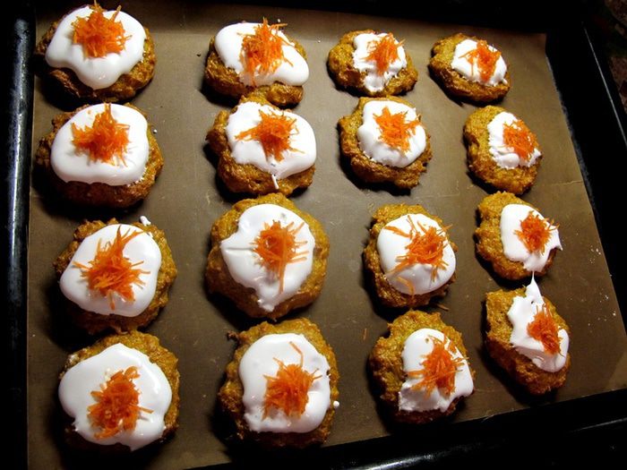 Достаем из духовки печенье и ложкой наносим на него глазурь. Она прекрасно ложится, не течет и блестит. В серединку можно положить немного натертой цедры, или моркови, или каплю абрикосового джема. Затем ставим печенье на 5 — 10 минут в выключенную духовку, чтобы подсушить глазурь.