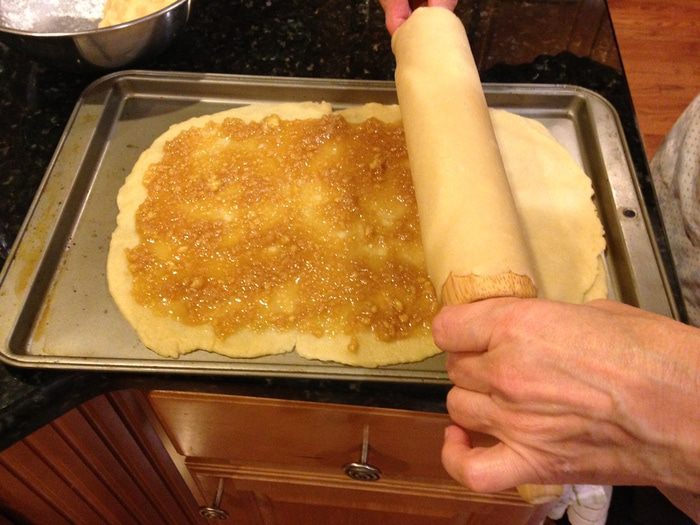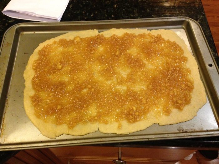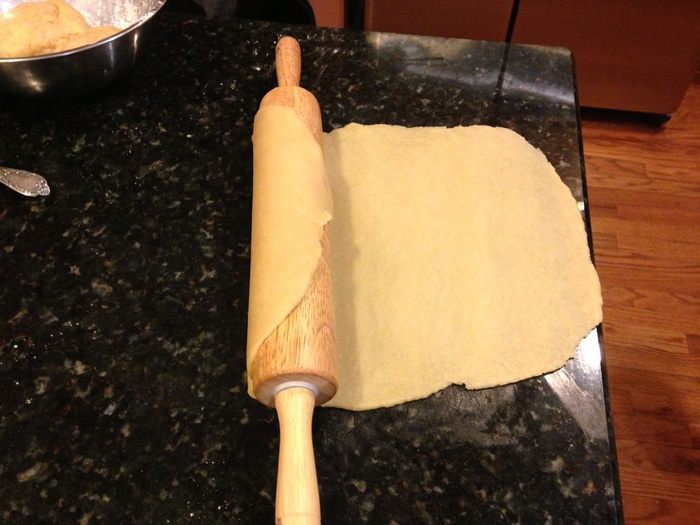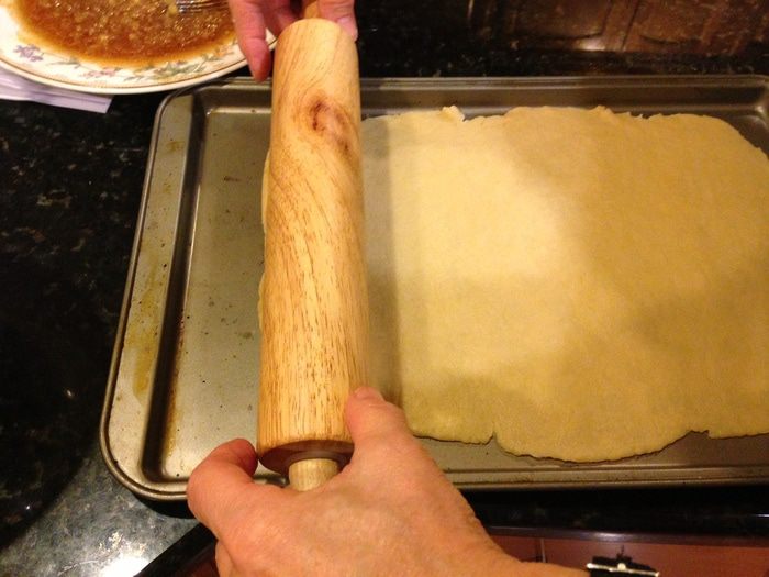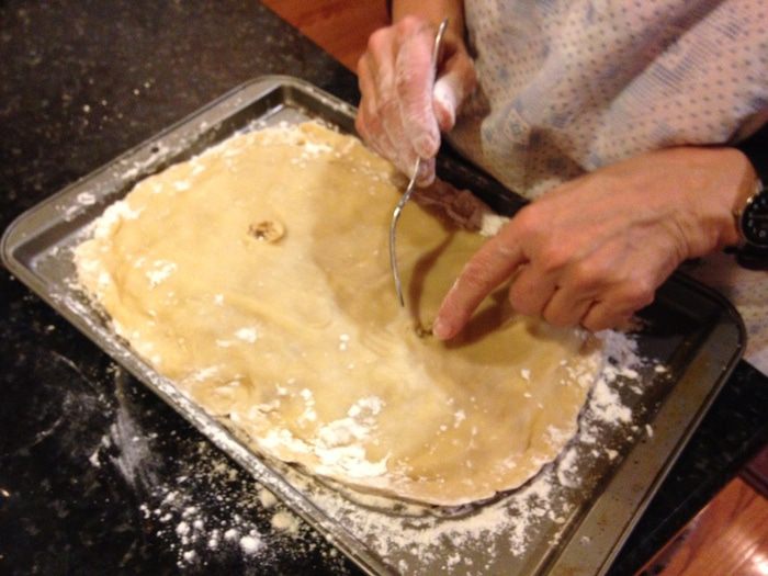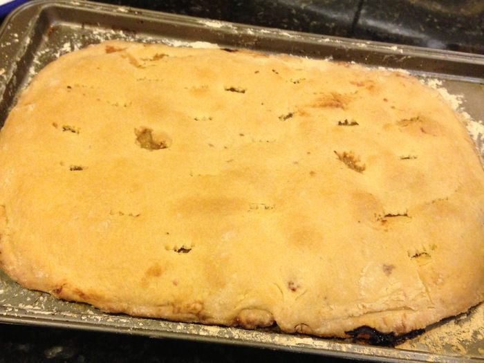Раскатать оставшийся третий слой и сделать небольшие углубления(не до дна!), можно еще дополнительно наколоть вилкой. С помощью муки завернуть края и отправить в духовку на 180°С минут на 40.