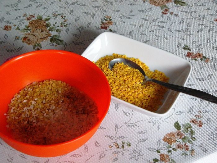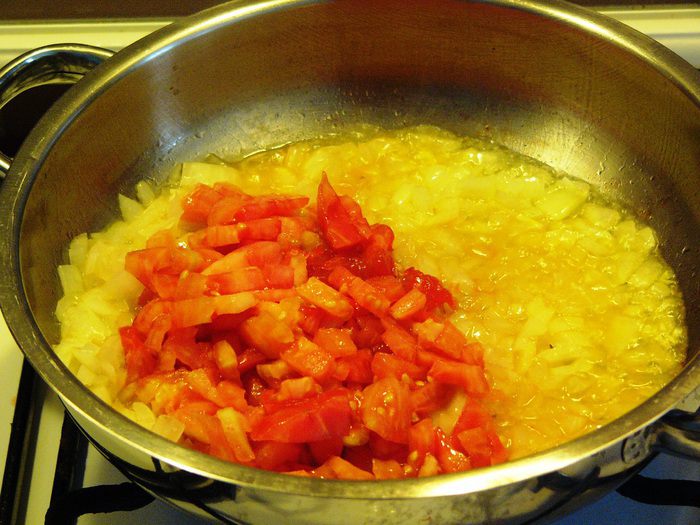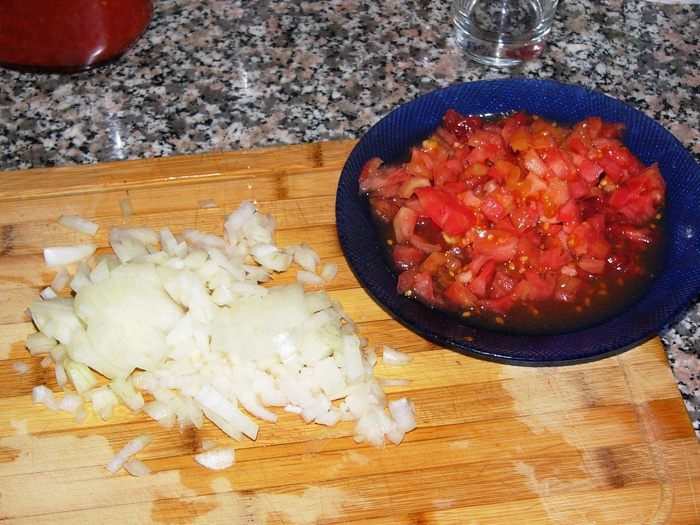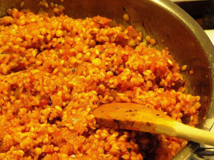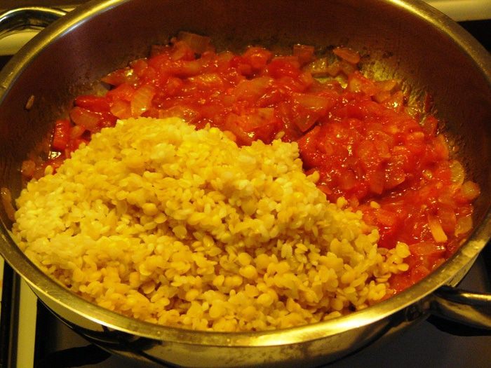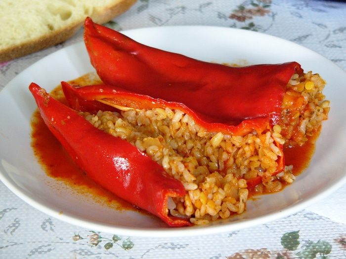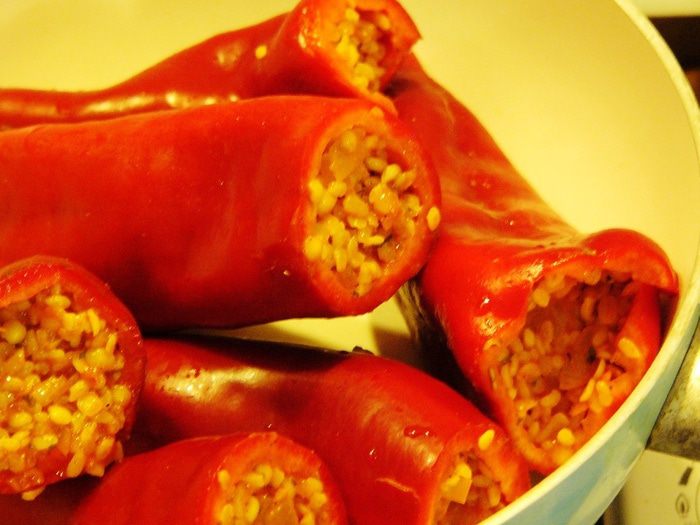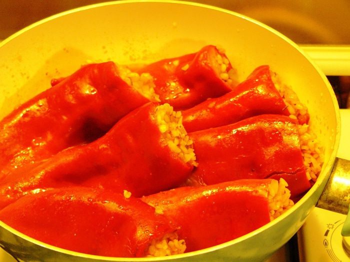 В качестве повседневного блюда, каким оно у нас и является, я использую заливку из стакана воды с томатной пастой и солью. Но можно похлоптать и приготовить соус из лука, помидор, чеснока с лавровым листом и петрушкой. Залить перец соусом (достаточно на 2-3 см высотой, перец еще пустит свой сок) и сбрызнуть оливковым маслом. Тушить под крышкой 30 минут. Опять же, не передержите, иначе рис и булгур сильно разварятся.