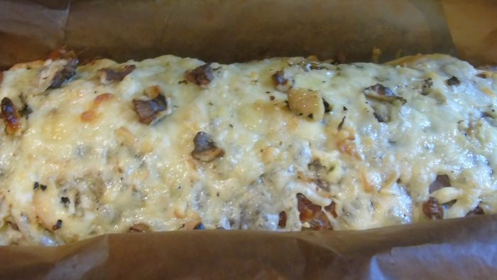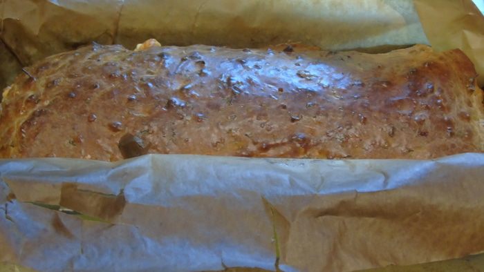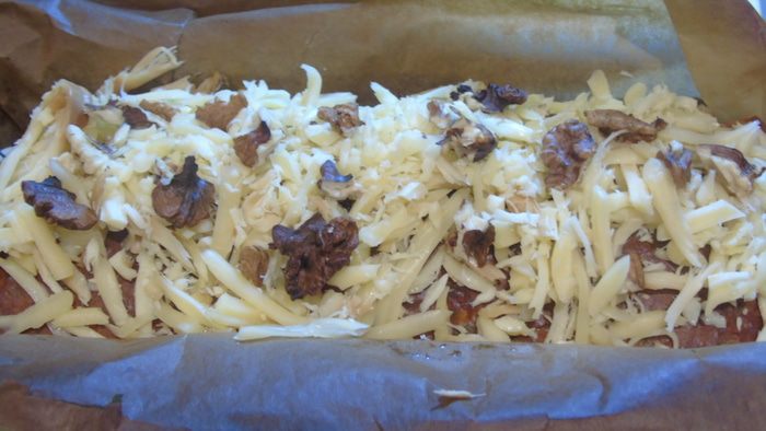 Достаем кекс, посыпаем отложенным сыром и орехами (1 ст. л. грецких) и отправляем еще в духовку, до готовности. Проверяем палочкой, она должна выходить сухой.