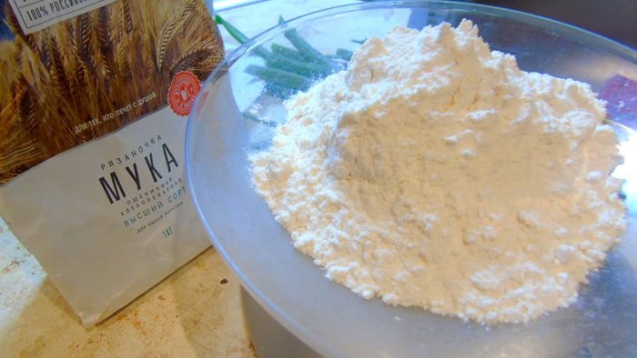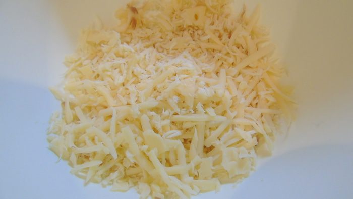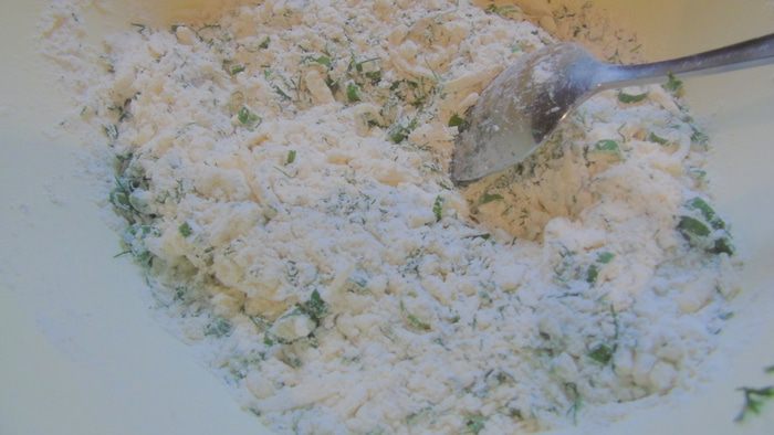В сыр добавляем муку и все остальные сухие ингредиенты и нарезанную зелень, перемешиваем.