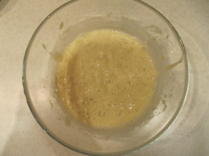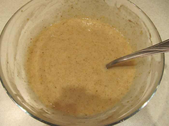 К банановому пюре добавить мед и хорошо перемешать. Ввести растительное масло, запаренные семена льна, ванилин, соль, молотые корицу и имбирь. Перемешать до однородности.