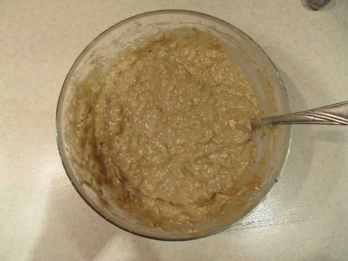 Добавить просеянную с разрыхлителем муку и овсяные хлопья. Все перемешать.