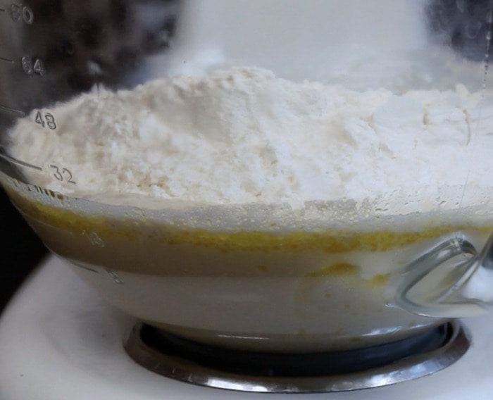 Добавить к этой смеси сначала 300 г муки и перемешать. Затем добавить оставшиеся 60 г муки и замешать тесто.