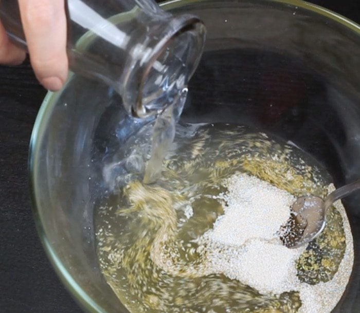 В большой миске соединить теплую воду, дрожжи, мед и оливковое масло. Оставить созревать на 10 минут.