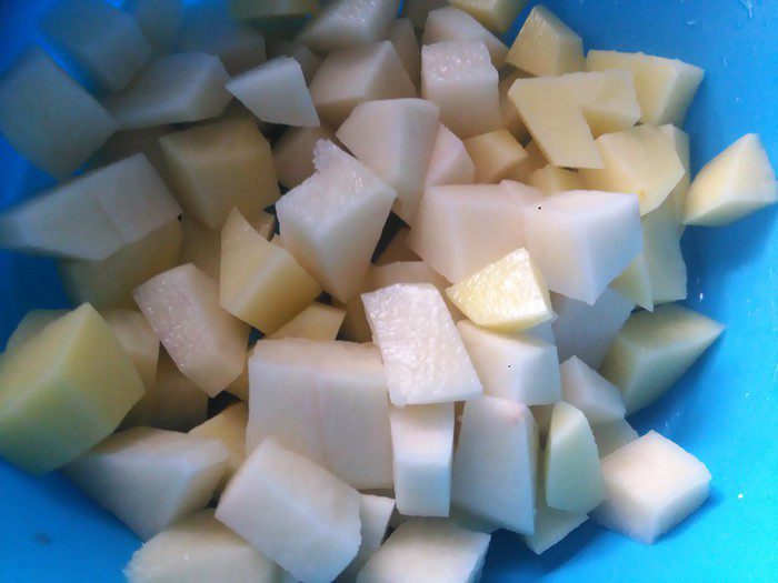 Чистим, моем картофель и нарезаем кусочками.