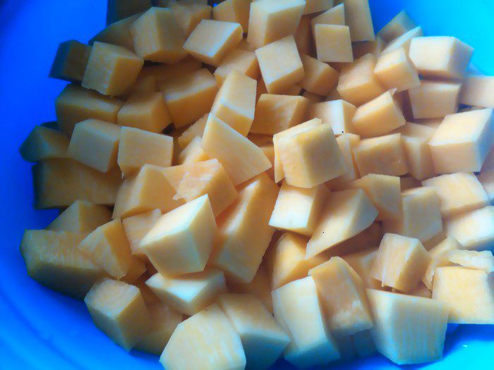 Чистим тыкву и нарезаем кусочками.