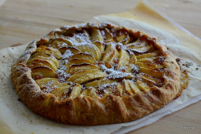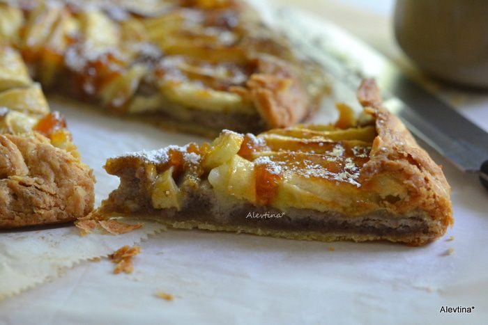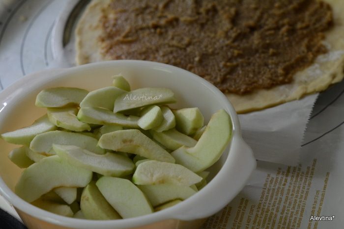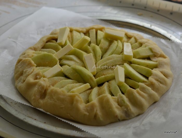 Выложить яблоки поверх ореховой начинки в красивом порядке. Посыпать сверху крупным сахарным песком. Сливочное масло 2 ст. л. порезать, выложить поверх яблок. Свернуть тесто с краев в по кругу в верх. Поставить в духовку на 40-45 минут.