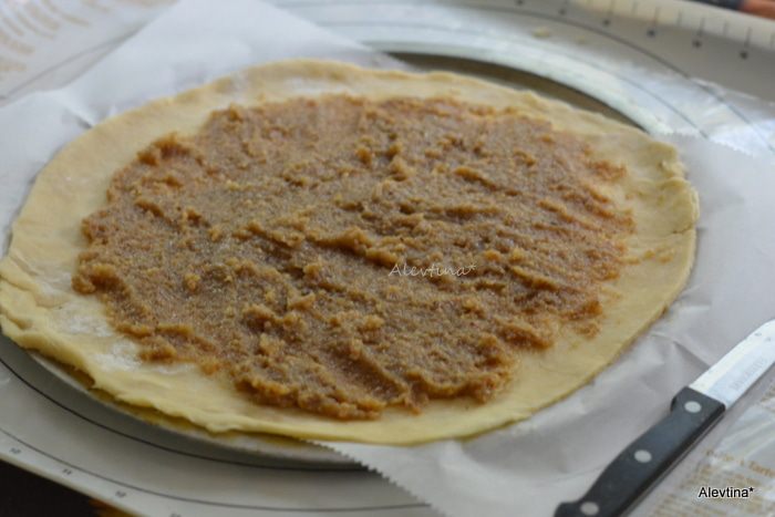 Выложить ореховую пасту на тесто, оставляя края свободными.