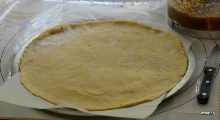 Раскатать тесто в круг 31 см на бумаге с мукой для выпечки с обеих сторон. Это размер небольшой пиццы противня. Переложить на противень .