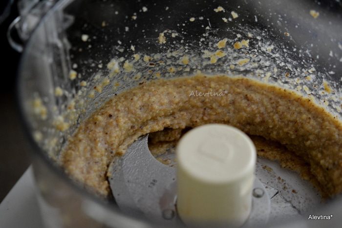 Измельчить орехи с сахаром, яйцом и 1 ст. л. сливочного масла, ванилин и соль.