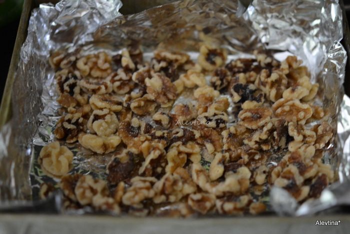Грецкий орех подсушить в духовке при температуре 180 гр 7-8 минут.