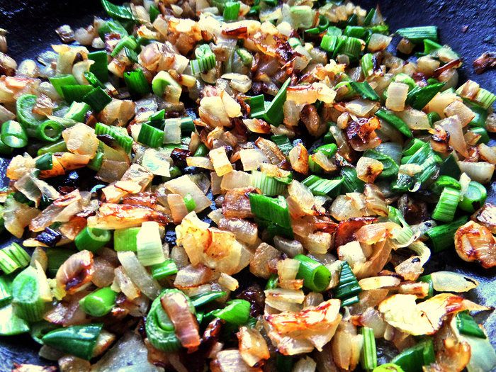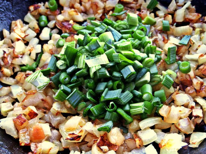 К обжаренному репчатому луку высыпать измельченный зеленый лук.