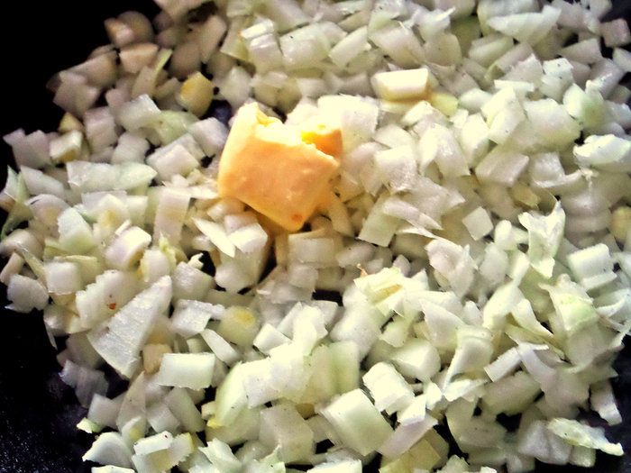 Лук и чеснок покрошить и высыпать в сковороду с кусочком масла.