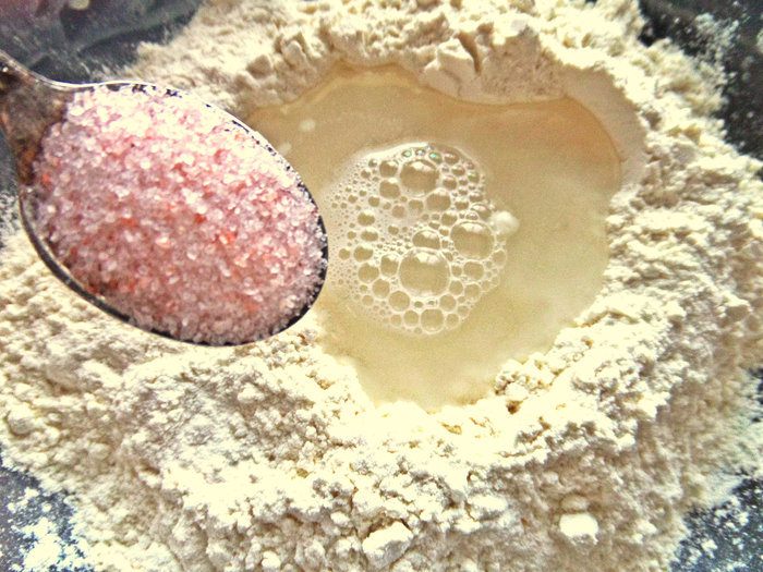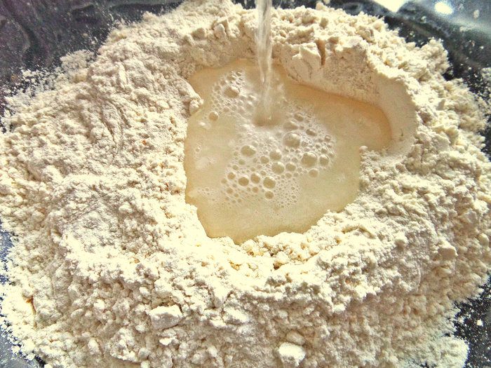 Тесто крутое постное. Вливаем в ямку из муки теплую воду.