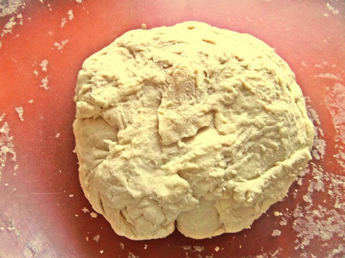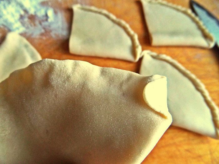 Каждый шарик раскатываем толщиной 2 мм, остальные убираем в пакет, чтобы не обветрились. Круг (размером с блюдце) делим пополам.